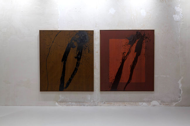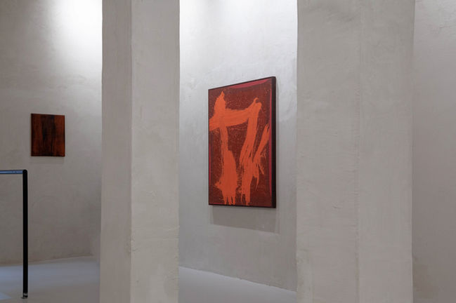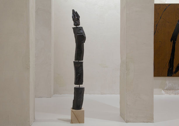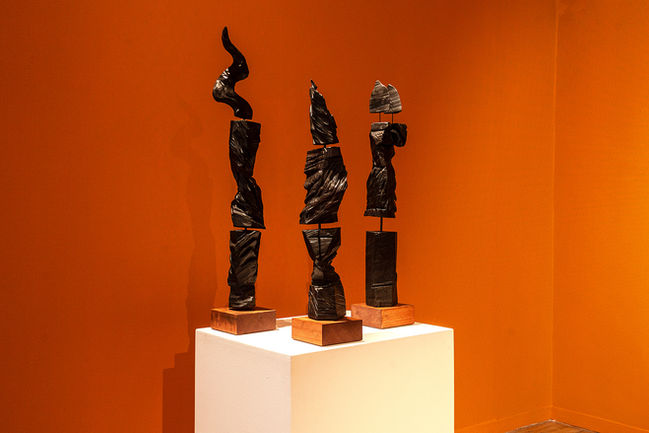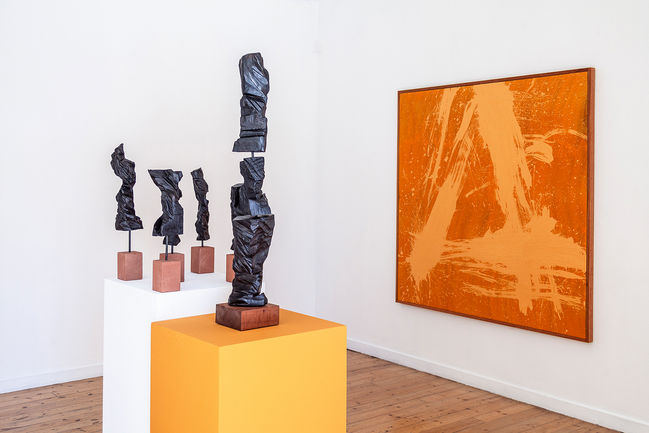 During the intensive residency, I was able to dive deeper into an already existing relationship with nature. The paintings harnessed their colours from the late autumnal blaze as he began the residency in 2023, each day introducing a new colour into my palette. Not long after I arrived I began incorporating wood carving into my practice. I was gifted a century-old Cedar tree which fell during storm Arwen (November 2021) on the Marchmont Estate nearby the studio and set about carving it in sections with a chainsaw, grinder and various hand tools. The surface of the wood was then charred and finally finished with beeswax.