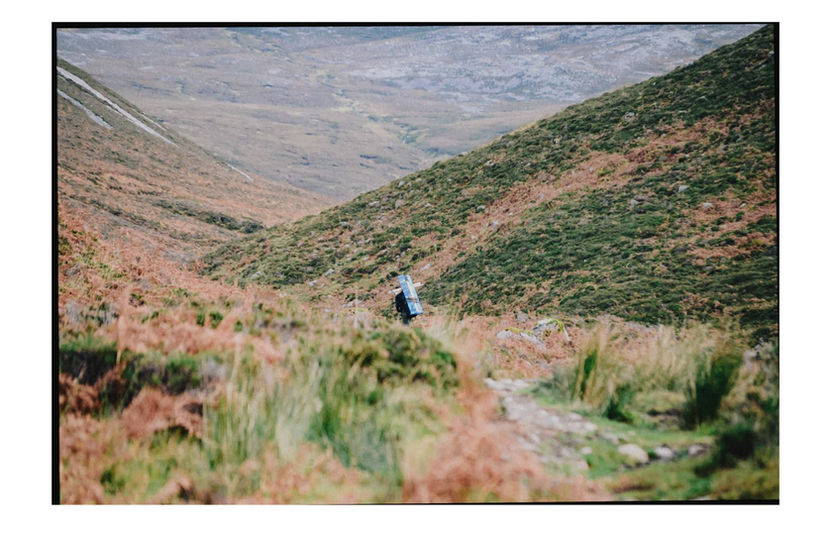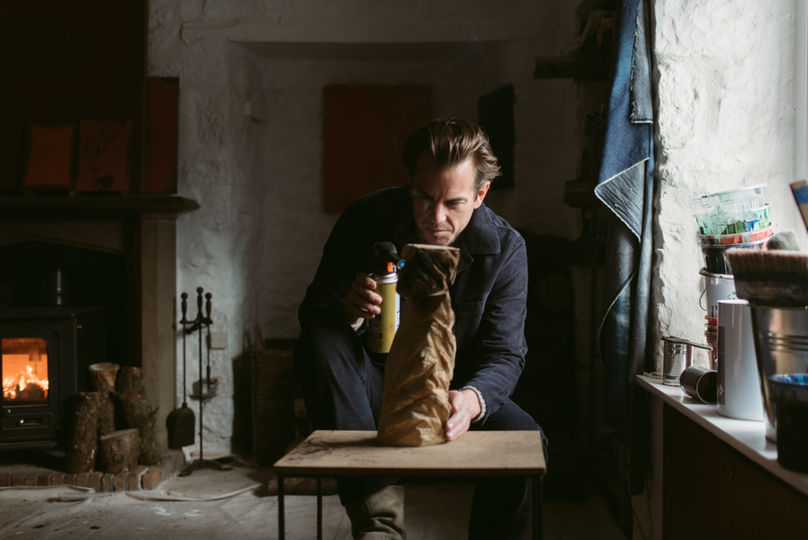 In November 2021, I undertook my most arduous challenge to date. I carried three stone sculptures, their plinths, three paintings and a mobile studio, on his back up to the remote ‘Bone Caves’ in the far north of Scotland. I set up a studio and completed the paintings in the cave, camping overnight. I was joined by a small film crew and my two sons. The first iteration of the exhibition took place in the cave, the morning after his ascent.